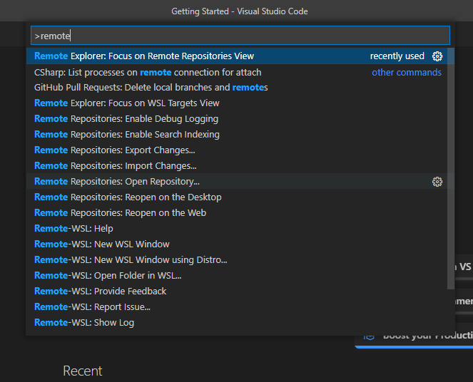 After installing the extension, in Code, press Ctrl+Shift+P or press the icon at the bottom left corner to bring up a dialog for entering commands and then type remote.