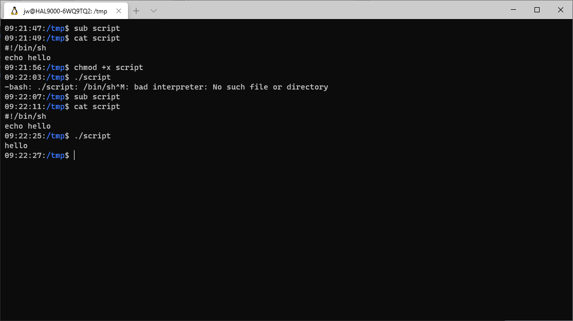 The issue is with the difference between Unix and Windows line terminators. Will our far distant descendants still be hassled with conflicting slashes, conflicting line terminators, space and other “special” character escaping requirements, multiple types and levels of nesting of quoting, and other legacies from previous centuries? Can we really not automate solutions to any of these, especially something like supporting windows line terminators in shell scripts on Windows Subsystem for Linux?