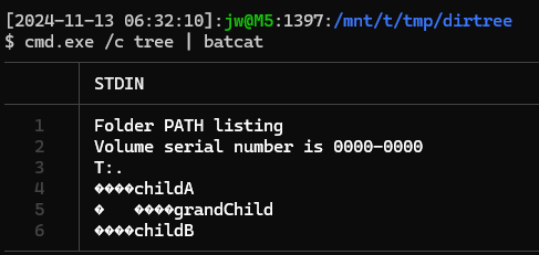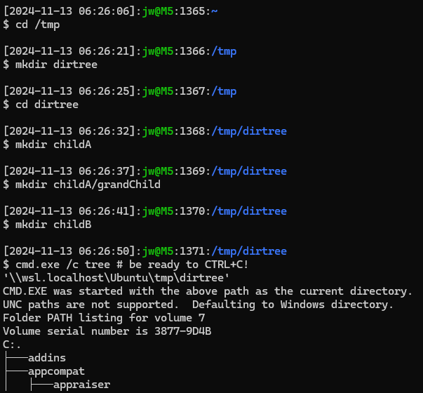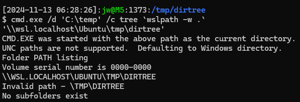 Instead, we can set the current working directory to a Windows file system temporarily while invoking cmd.exe and then reset it afterwards. This is easy enough if we can be confident that /mnt/c (C:) exists, which is likely if the machine is running. We also need to pass the Windows path to tree.