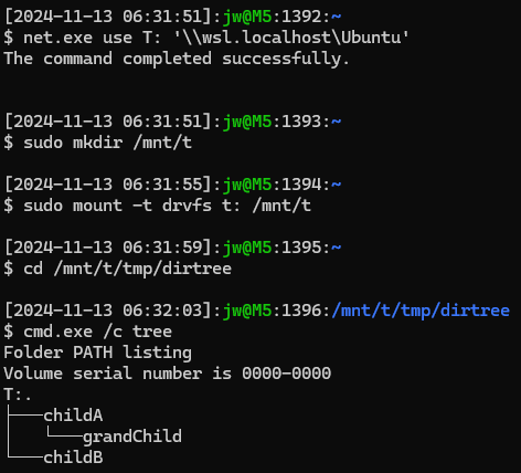 A couple of issues: we must mount a drive (for tree) and change the current working directory to the Windows drive that represents the WSL file system (for cmd.exe). We might just have to change the current working directory to a Windows file system before invoking commands that don’t depend on a Windows drive letter.