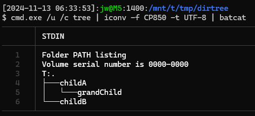 cmd.exe /c tree | iconv -f CP850 -t UTF-8 | batcat