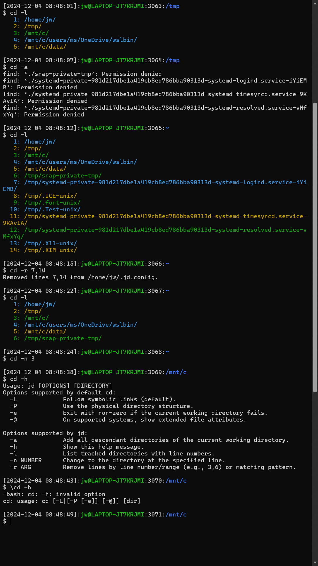 This blog post introduces the jd function that enhances the cd (change directory) command for Bash shells under WSL to make it easier to access past working directories without the need to remember or type their paths, as well as to allow typing and pasting Windows paths. You can use the jd function just asContinue reading “WSL Bash CD Enhancement to Track Directories Across Sessions”